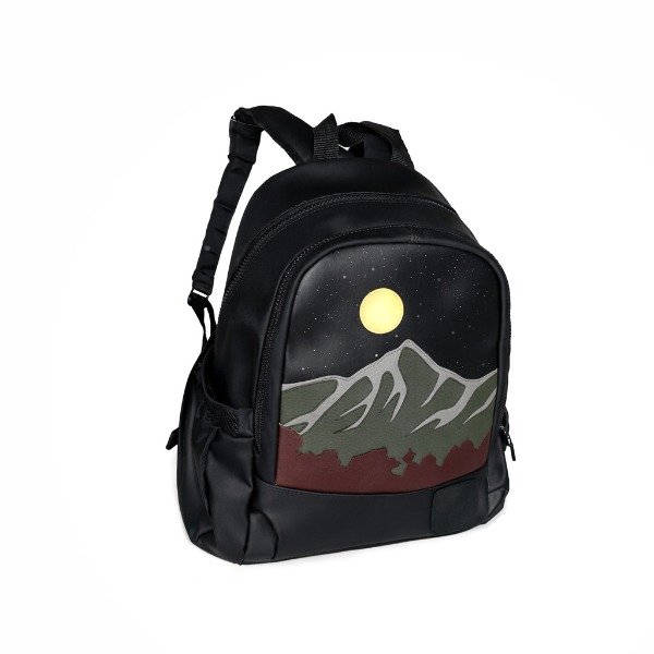 En el frente, un paisaje nocturno intervenido manualmente: montañas recortadas y ensambladas una a una bajo un cielo oscuro con luna plena. La escena funciona como territorio portátil y punto de orientación en movimiento.