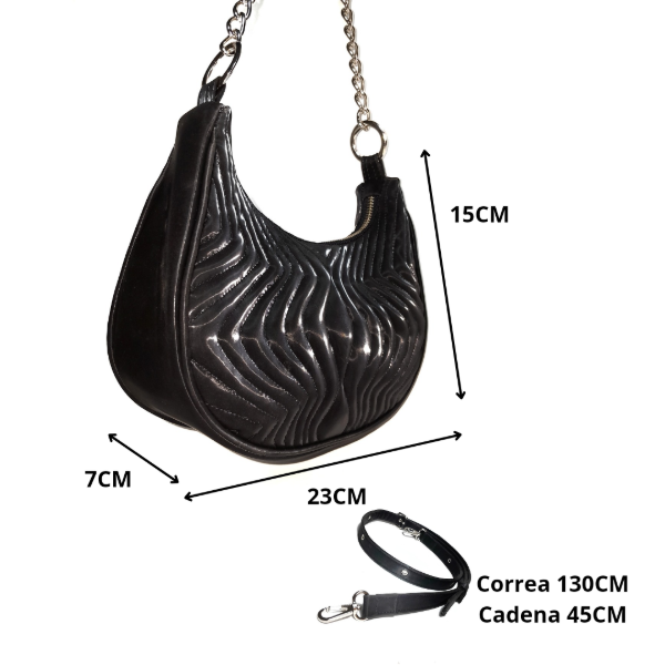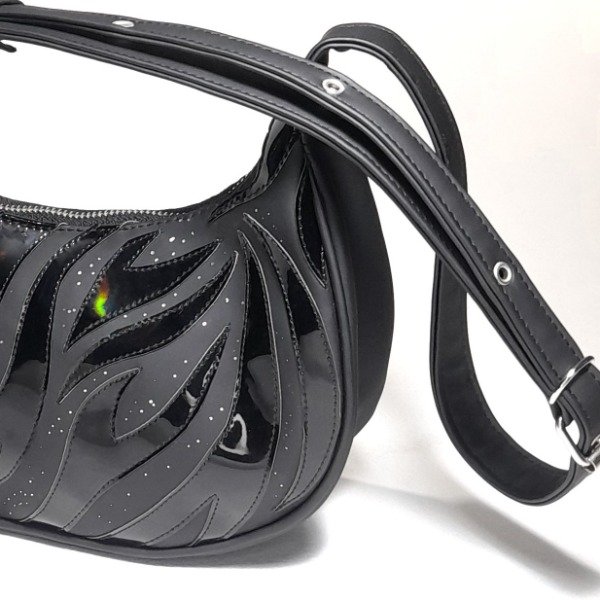 Bandolera confeccionada en engomado y charol holografíco sintético, diseñada para cuando baja el sol.